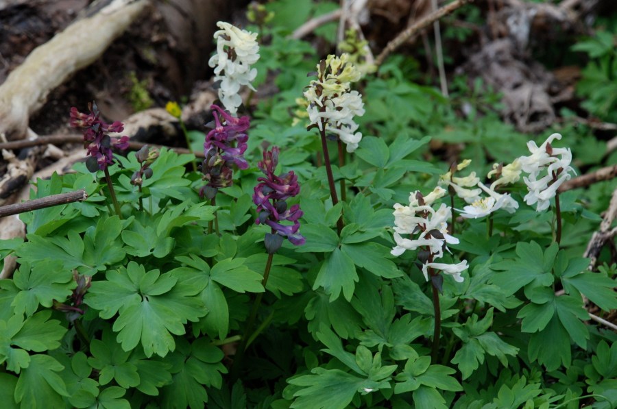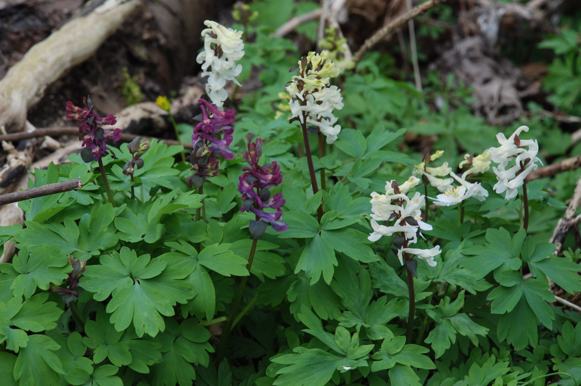 Hulrodet lærkespore i sine to farvevarianter i Svartingedalen. (Foto: Michael Stoltze).