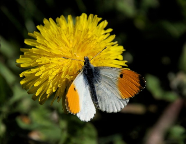 Aurora flyver, når mælkebøtterne blomstrer. Det er kun hannen, der har orange vingespidser (Foto: Michael Stoltze)