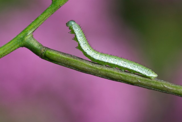 Spæd auroralarve, som lige er kommet ud af ægget. Første måltid er æggeskallen. På pengeurt. (Foto: Michael Stoltze).
