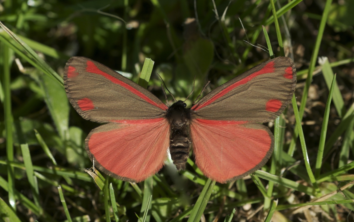 I dag dukkede der en dugfrisk blodplet (Tyria jacobaeae) op i min have! Herligt dyr. Den var tydeligvis på vandring og stak af, før jeg nåede at fotografere den. Så billedet er et trickfoto af en dødt eksemplar fra en samling (sorry…).
