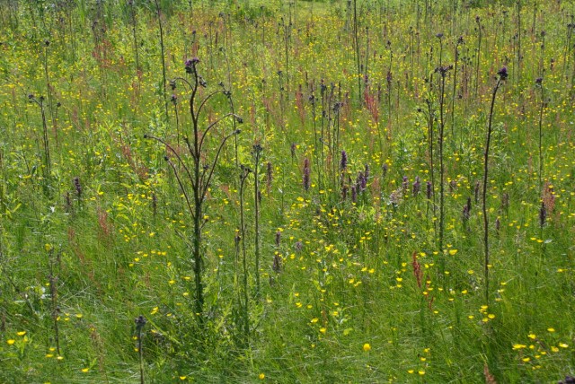 En rigtig eng med orkideer, ranunkler, trævlekrone og ikke mindst violette kærtidsler, der afslører den fine eng på lang afstand. (Foto: Michael Stoltze)