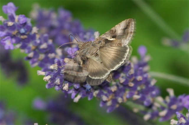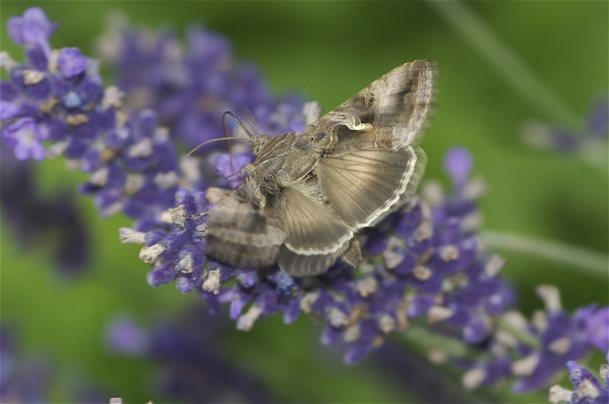 De grå gammaugler svirrer uroligt i lavendlerne for tiden. Den kendes på forvingens sølvskinnende mærke, der ligner det græske bogstav gamma. Gammauglerne har svært ved at overvintre i Danmark, men kommer trækkede til os fra Sydeuropa hvert år. Om sommeren yngler de flittigt. Derfor er der masser af gammaugler nu - både indfødte og indvandrere fra syd. (Foto: Michael Stoltze).