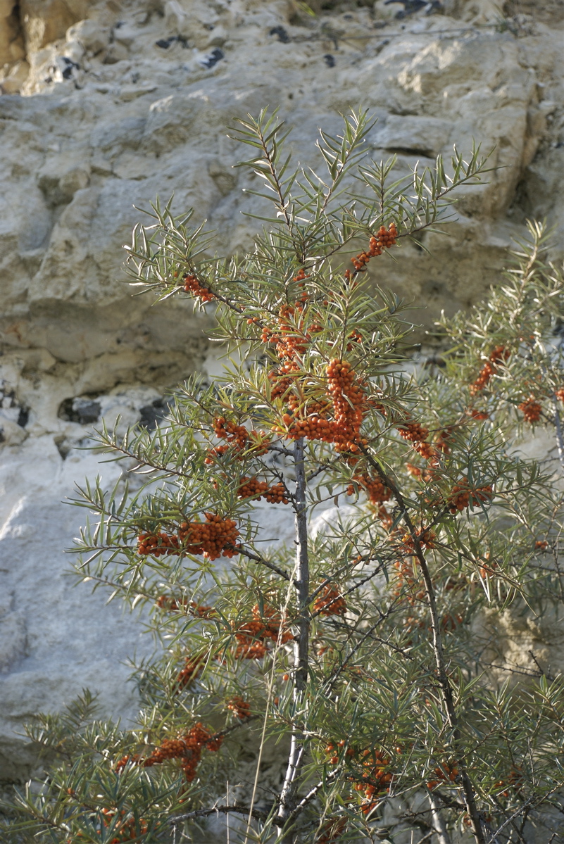 Det er havtorn, som har været i Danmark lige siden sidste istid. Busken er mester i at erobre rå, stenet og muldfattig jord. Dens rødder er nemlig besat med bakterieknolde (engang kaldet “strålesvampe” – men det er bakterier), der kan omdanne frit kvælstof til kvælstofforbindelser, som busken kan optage og bruge, når den skal danne aminosyrer og protein. Det er én af forklaringerne på, at havtornen kan gro så ydmyge steder, og at plantens bær indeholder et utal af sunde næringsstoffer og vitaminer.