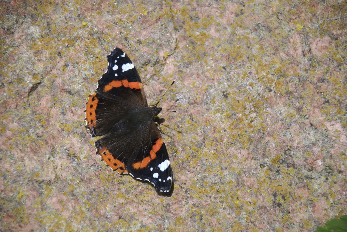 Den flotte admiral kan være talrig i oktober, hvor den ofte soler sig på varme sten og stammer. Mange admiraler flyver sydpå for at overvintre i Middelhavslandene, men en del forsøger også at overvintre som voksne i Danmark, og det kan de i meget milde vintre. Admiralen er den eneste sommerfugl, der er set frit flyvende i Danmark i alle årets måneder. (Foto: Michael Stoltze).
