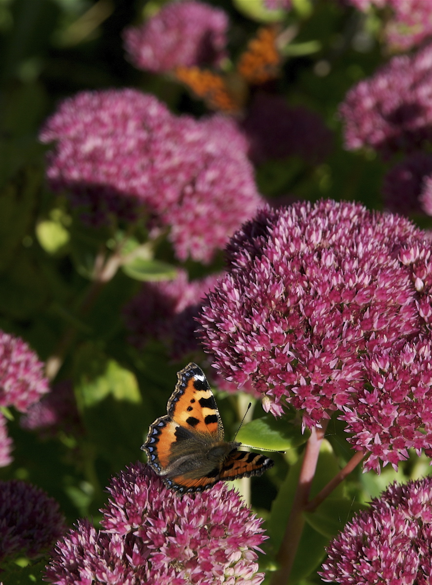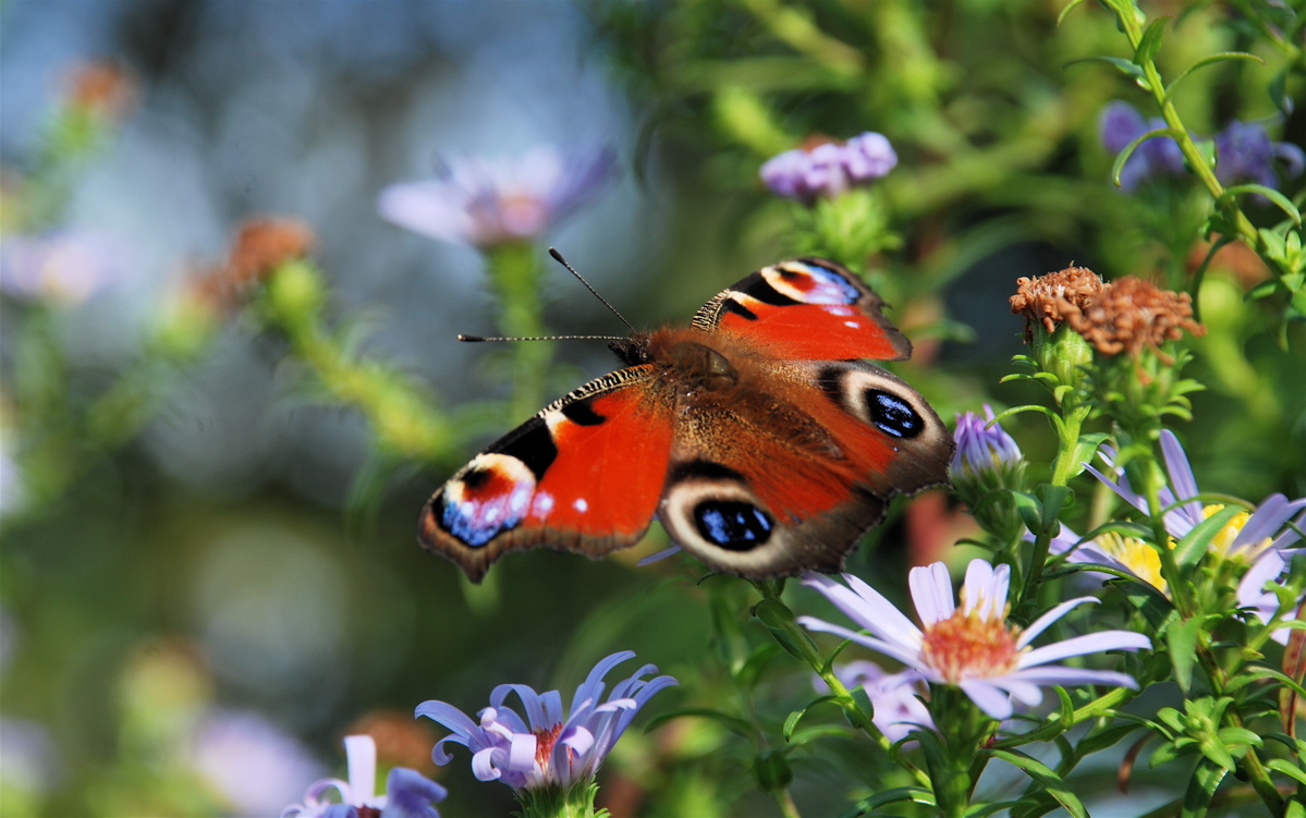 Nældens takvinge – der er Danmarks nationalsommerfugl – kan ses i haverne langt ind i oktober, hvor den bl.a. tiltrækkes af sankthansurt. Den overvintrer siden indendørs i kolde rum, hvor den går i dvale. Den vågner først op til dåd i det tidlige forår, hvor sommerfuglene parrer sig og lægger æg på nælder. (Foto: Michael Stoltze).