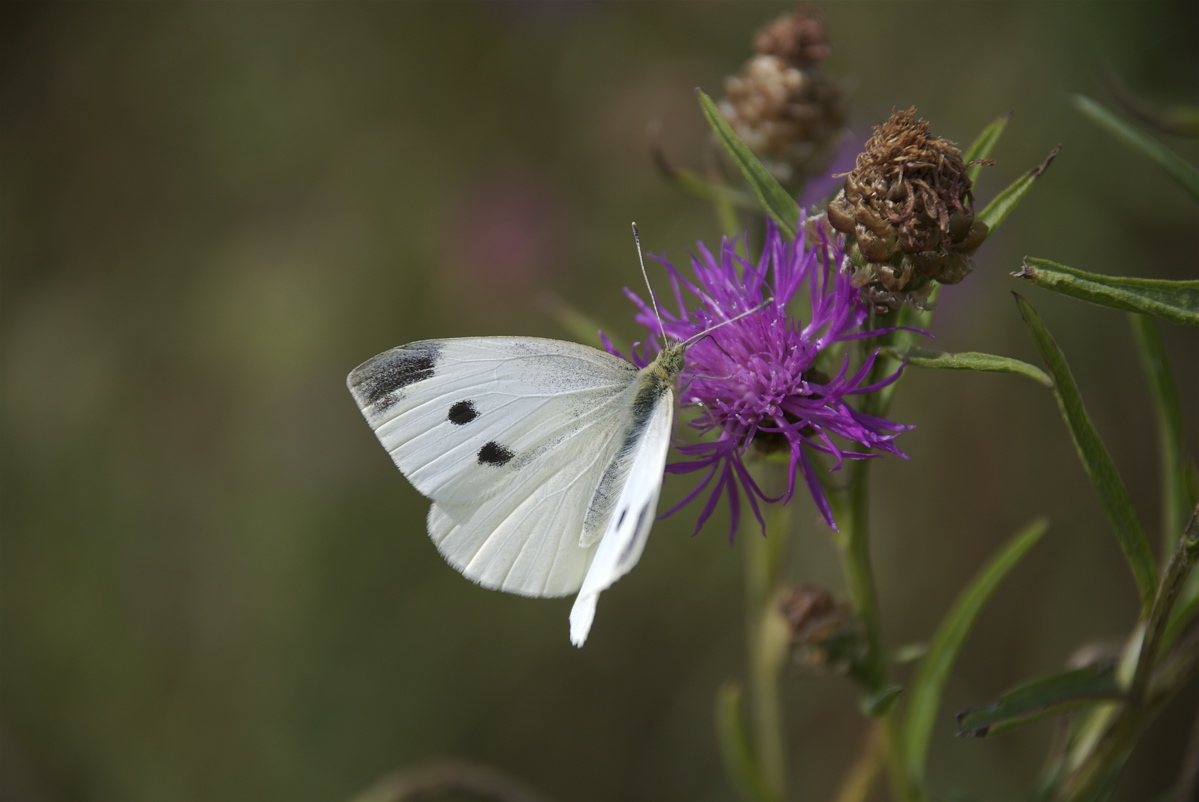 Den lille kålsommerfugl flyver ligesom de to andre arter af kålsommerfugle (stor og grønåret kålsommerfugl) i mange generationer i Danmark. På solrige, lune steder med læ kan den være ret talrig i oktober, hvor den suger nektar på knopurt og andre sene blomster. (Foto: Michael Stoltze).
