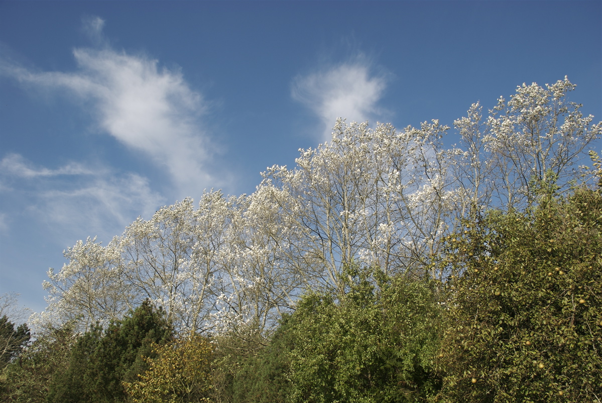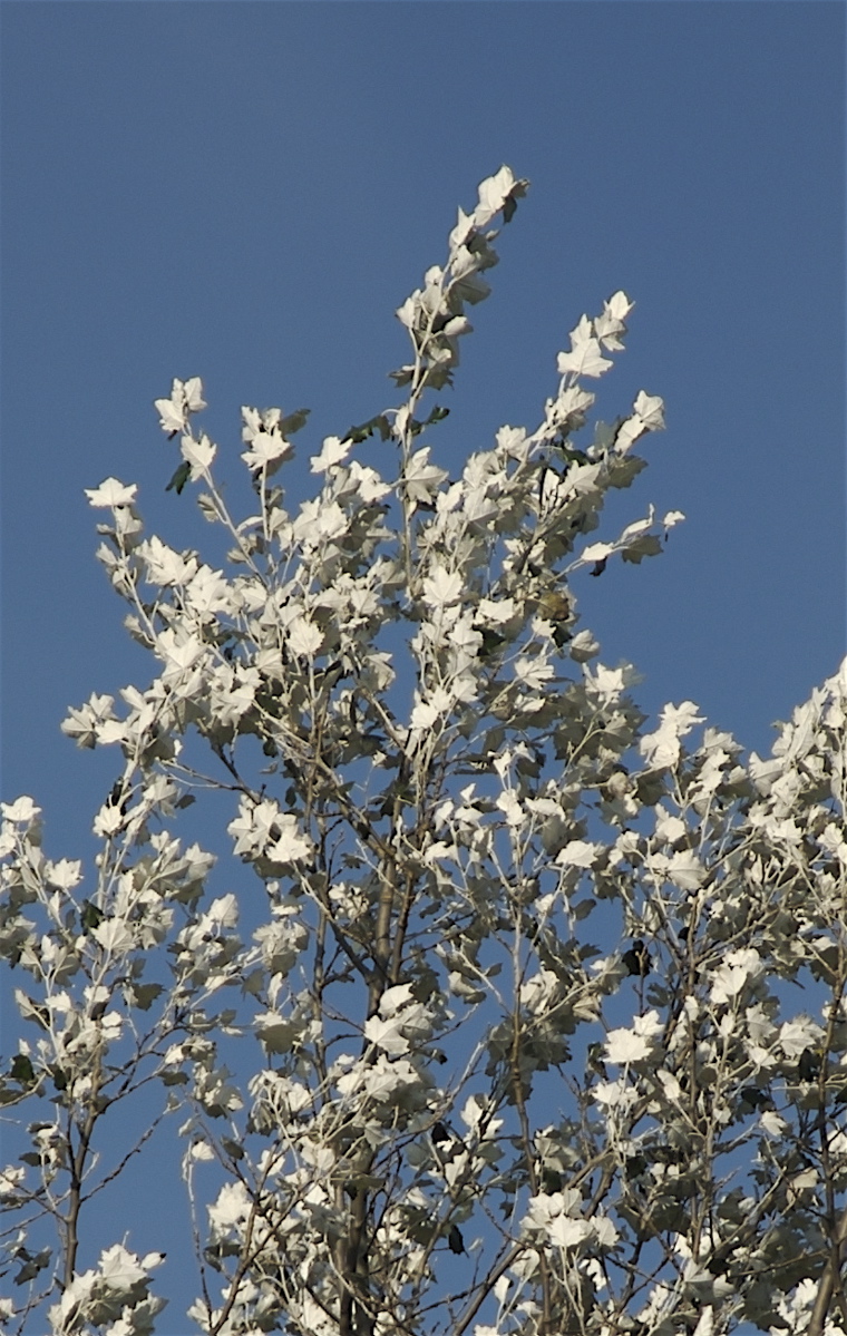Det er sølvpopler, der bærer lange skud med store blade, som har en tæt pels af sølvskinnende hår på undersiden. Vinden løfter og samler de hvide bladundersider, så de vender ud mod omverdenen. Det forklarer sølvpoplernes lys over landet i den lavtstående sol.