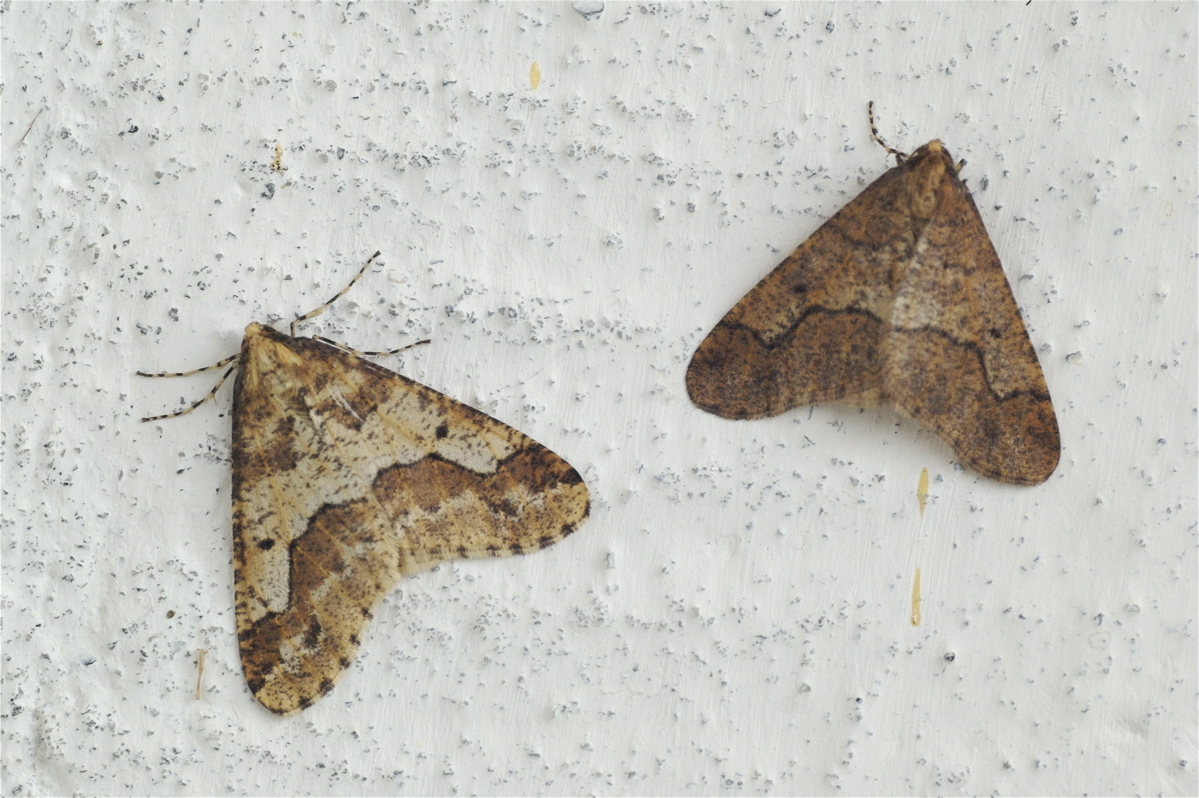 Et par hanner af den store frostmåler har sat sig på den kalkede væg ved hoveddørslampen 2. november. Hunnerne er helt vingeløse og kravler omkring i buske og træer, hvor de lægger æg. (Foto: Michael Stoltze).