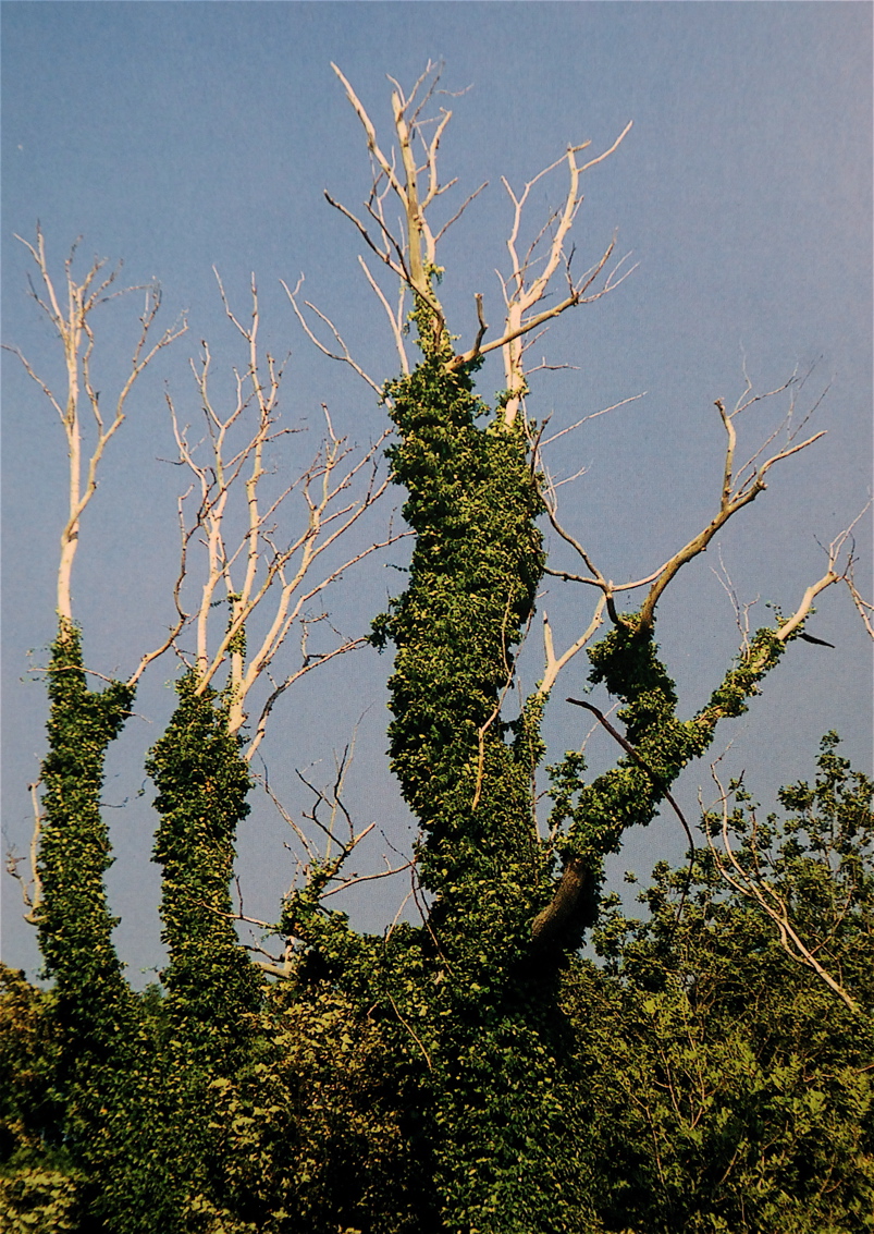 For nogle år siden, da elmesygen havde dræbt de fleste elmetræer, blev de døde træer overalt erobret af vedbend. Under de udgåede træer trængte lyset pludselig ned til jordoverfladen, der samtidig blev gødet med barkflager og ekskrementer fra fugle, der rastede i de nøgne træer. Derfor står de døde elmetræer nu helt dækket af vedbend mange steder. Lige indtil træerne rådner væk og falder sammen.