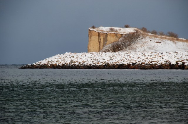 Klinterne ved Halsskov Odde kan ses fra Storebæltsbroen. 28. november 2010. (Foto: Michael Stoltze).
