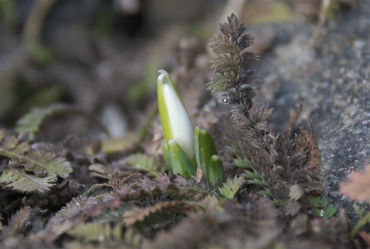 De betyder, og at der kan komme vækst i planter og spirer på milde og solrige dage. Vi får de første spæde forårstegn. I dag var den her så: Den første vintergæk i haven! Den er godt nok lille – men den er der.