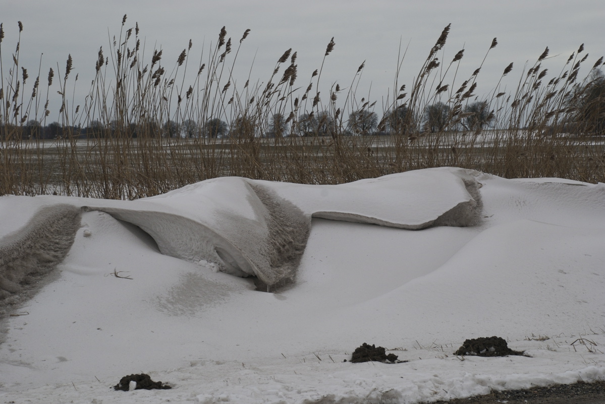 Efter mildt vejr med afsmeltning, søle og masser af smeltevandssøer i landskabet er det hele tørret ud og stivnet i den kolde, tørre vind. Isen er tyk og blank med et mylder af maleriske bobler. Og snedriverne ligger som sært vredne skulpturer i grøfter, hegn og gærder.