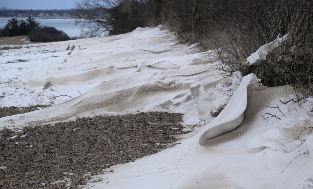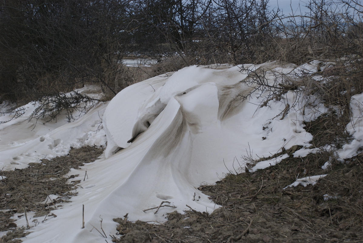Jorden er føget med, så det er skidensne, hvor formerne træder tydeligt frem. Og fygejorden i sneen suger de stadig mere magtfulde solstråler til sig og får driverne til at smelte på solsiden – trods frosten i luften.