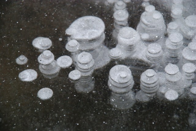 Virkelig flotte billeder! Jeg har aldrig set bobler i is på den måde som du viser i det andet boblebilledet. En slags etagebobler, de ligner nærmest svampe eller sådan noget. Ved du hvorfor de kommer til at se sådan ud? Er de et almindeligt syn?