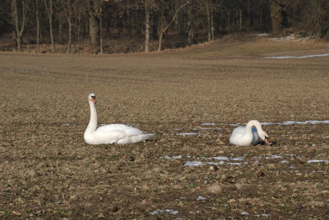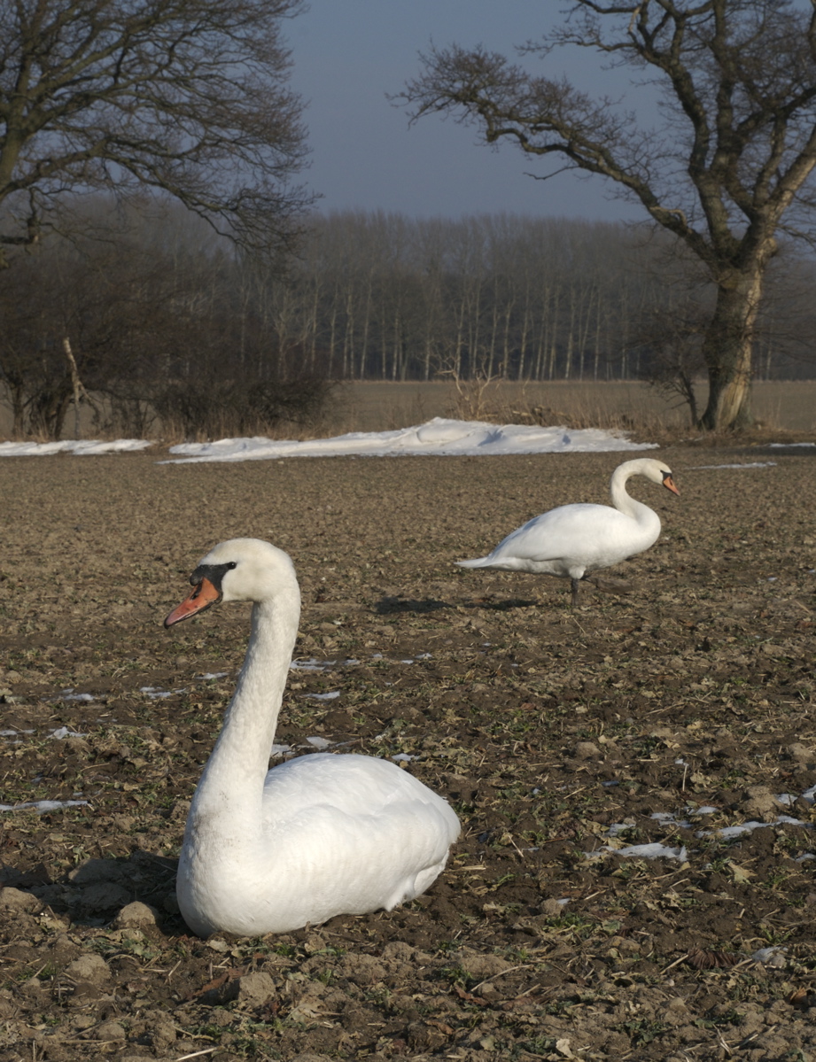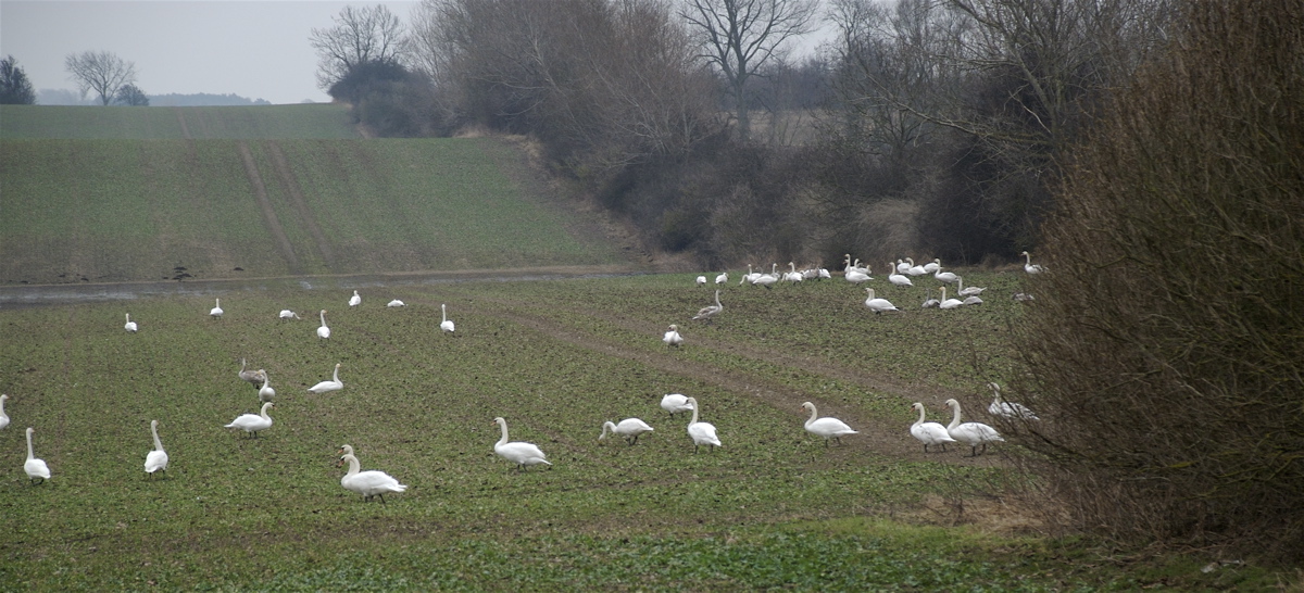 Svaner i begyndelsen af februar, da der stadig var en del at æde på rapsmarkerne ved Holsteinborg. (Foto: Michael Stoltze).