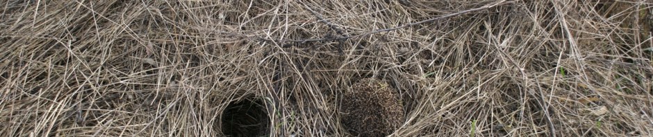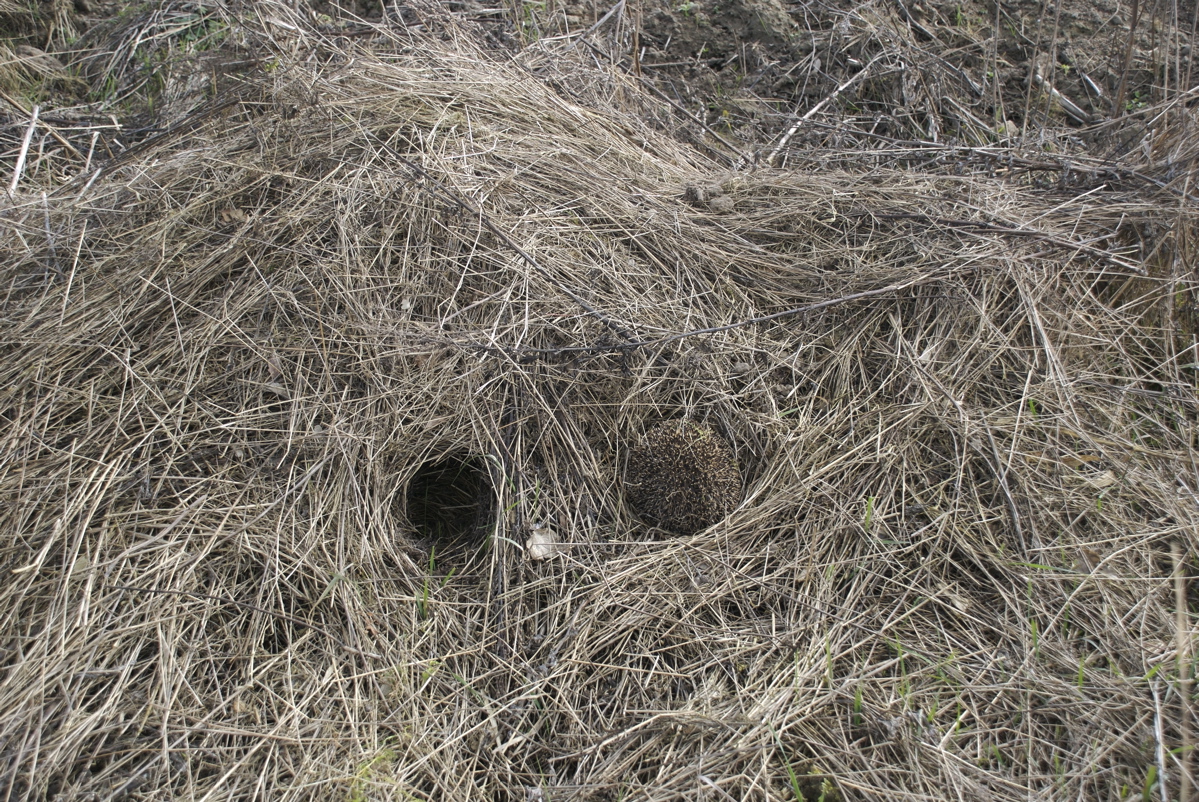 Men nu har jeg opdaget, at stakkene er hullede som oste indeni, fordi pindsvinene har haft en langvarig tur i høet hele vinteren. Nu er de så småt begyndt at komme frem efter vinterdvalen. De afslører sig med ca. 10 cm brede huller i høstakkene og skinnende sorte lorte på græsset.