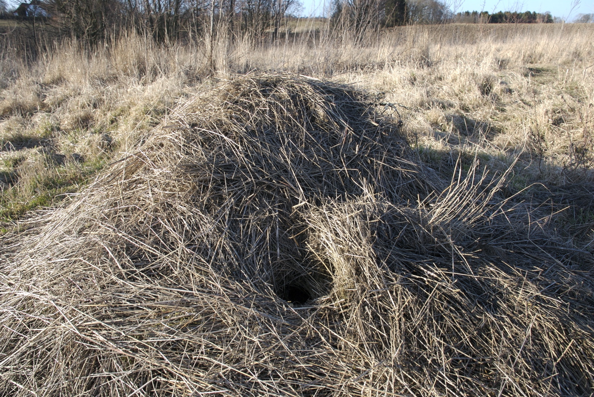 Pindsvinene er vågnet og forlader en af høstakkene 8. marts 2014. (Foto: Michael Stoltze).