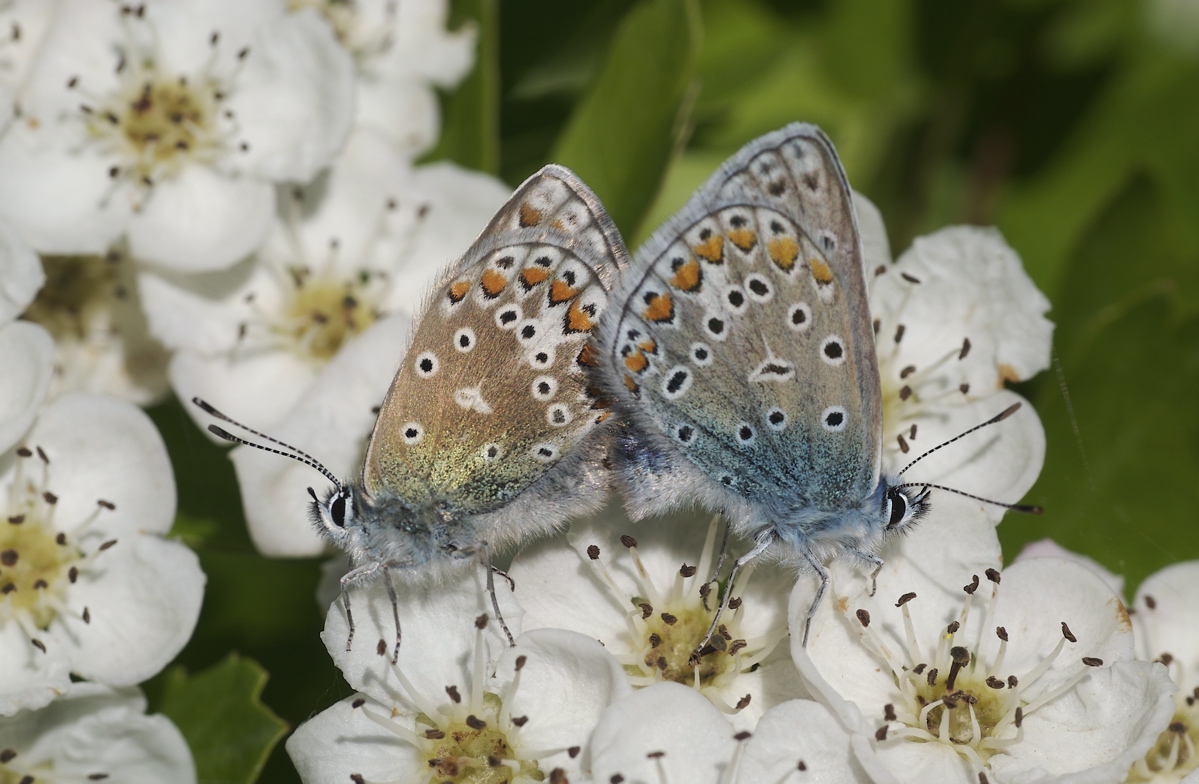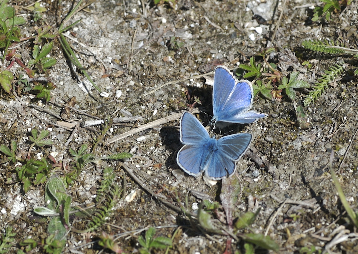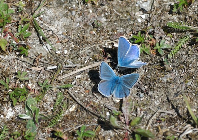 I denne tid er det også højsæson for 1. generation af almindelig blåfugl. De herlige små, blå sommerfugle holder af steder med kællingetand og andre ærteplanter (som larven lever på), rå jord og masser af sol og læ. Foråret 2011 har været solrigt og rigtig godt for arten. Så der er mange blåfugle i år. De strålende blå hanner har territorier, som de forsvarer indtil der kommer en parringsvillig hun forbi. Hvis der kommer en anden han ind i territoriet, bliver der kamp, der som regel ender med, at den indtrængende han flygter.