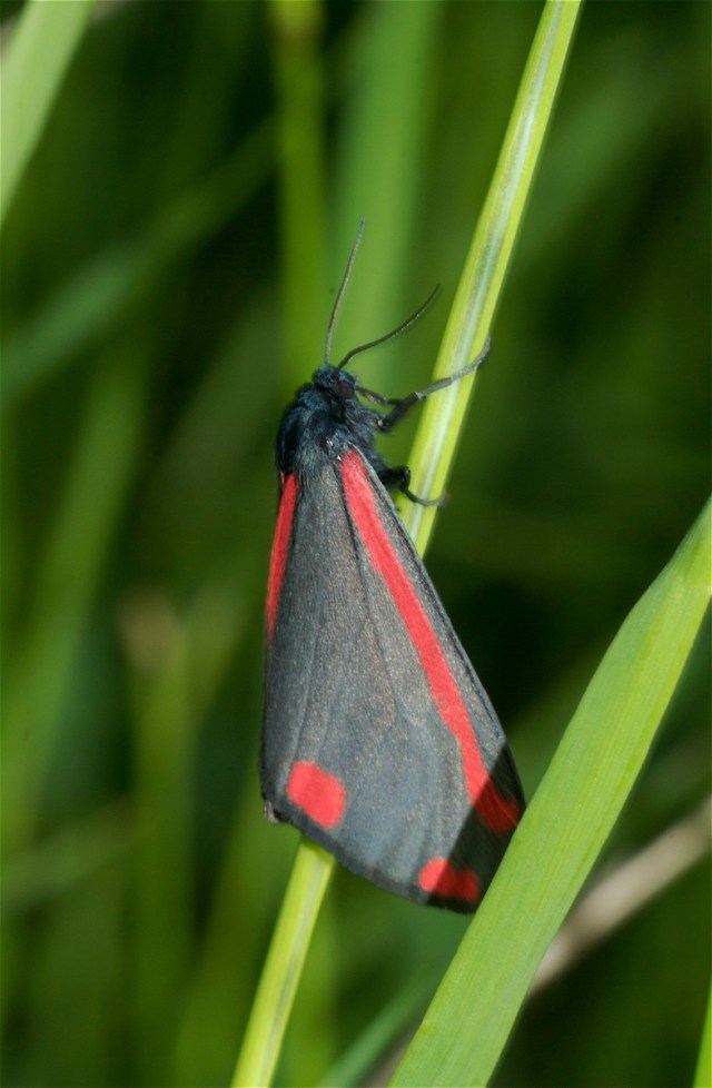 Den farvestrålende sommerfugl blodplet har bredt sig og er efterhånden ret almindelig i det meste af Danmark. Den strejfer vidt omkring, og lige nu ser man den tit flyve stille omkring i solen mellem højt græs, hvor den jævnligt hviler sig på strå. Når den flyver, lyser den op i græsset pga. sine postkasserøde bagvinger. Du kan læse mere her.