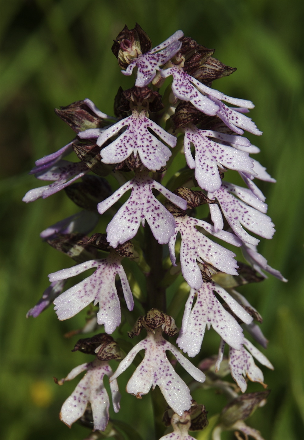 På tæt hold ligner blomsterne af stor gøgeurt små mænd med vide bukser og store hætter. (Foto: Michael Stoltze).