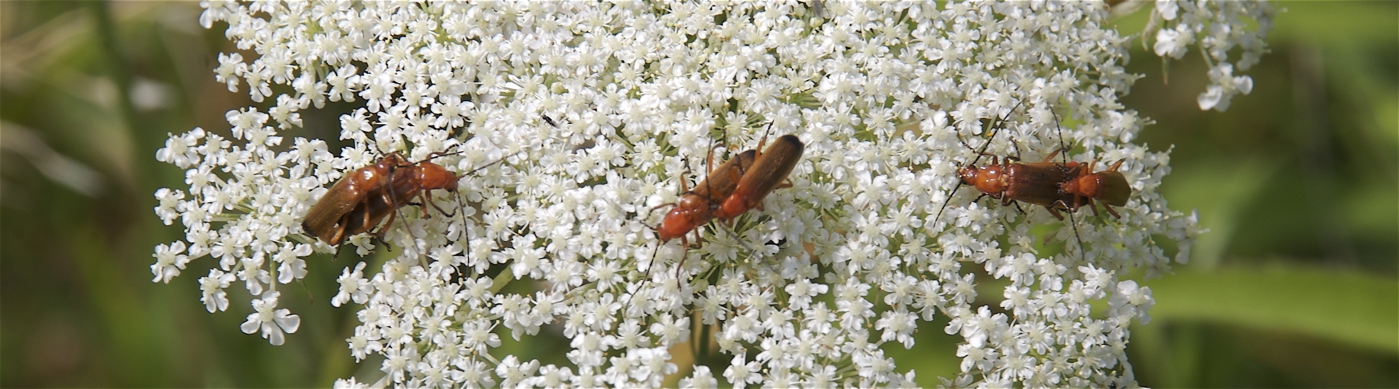 Lige nu, hvor den grøngule vilde pastinak og den sarthvide vilde gulerod står med deres skærme i fuldt flor overalt langs de danske veje, prydes blomsterne i hobetal af en lille, teglstensrød bille med mørk bagkropsspids.