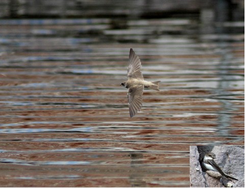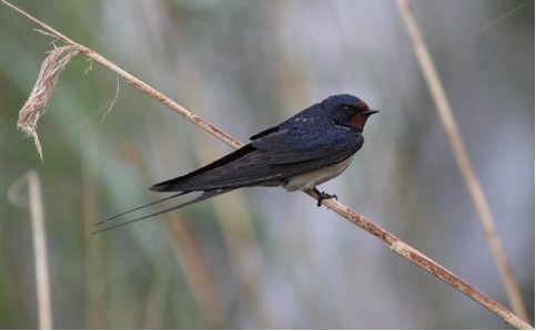 Efteråret er over os efter en til tider våd sommer, og det er ved at være tid til at sige farvel til de kære svaler. Vi har jo tre arter, hvoraf landsvalen er den almindeligste med omkring 200.000 par, der gerne yngler inden døre, hvilket sikkert har medvirket til artens popularitet, selv om det kan svine lidt, inden den får sine 2 kuld på vingerne. Landsvalen kendes let på den lange hale, den metalblå overside og rustrøde pande og strubeplet. I øvrigt er det sådan, at halens længde afspejler individets kondition: Jo længere hale, jo bedre form er den i. Denne er fotograferet under en af sommerens voldsomme byger.