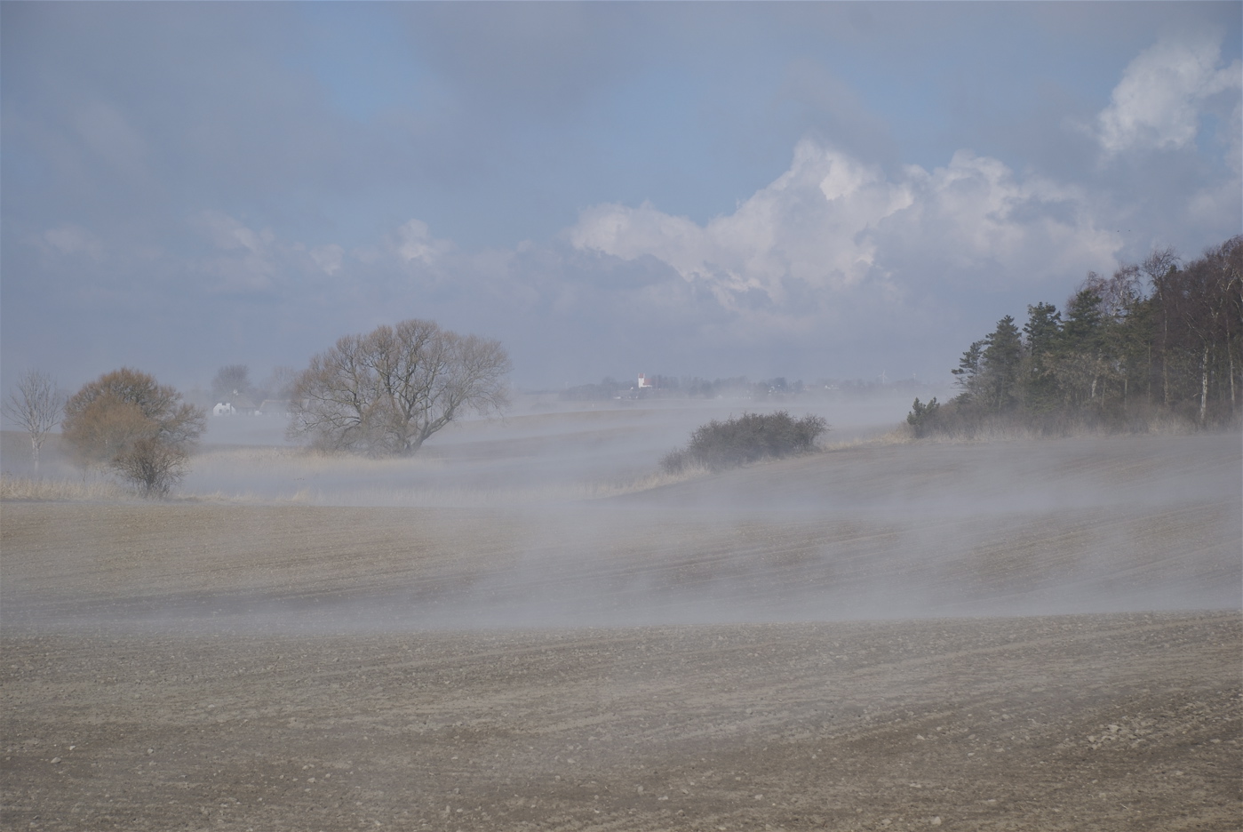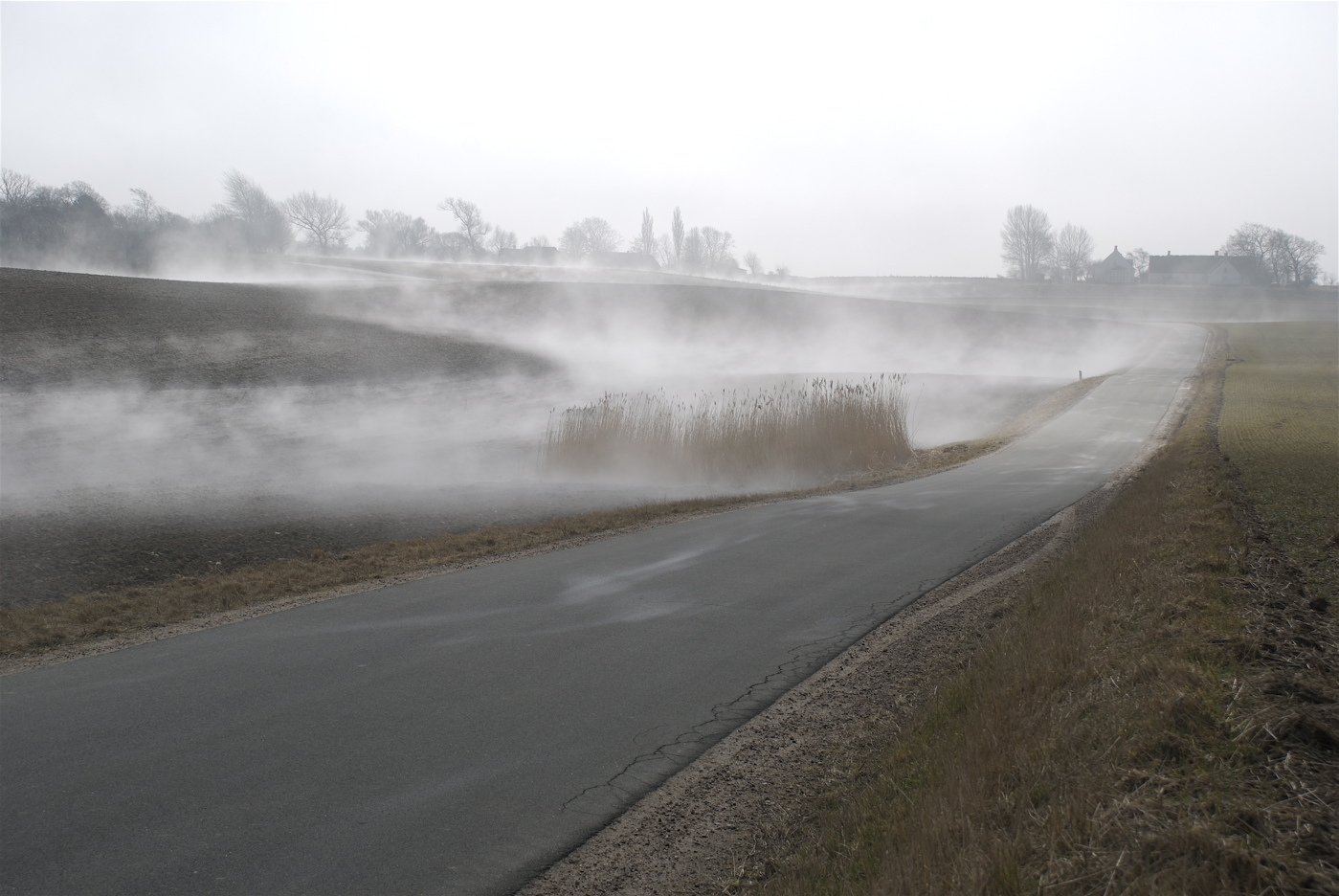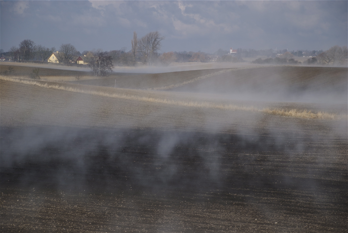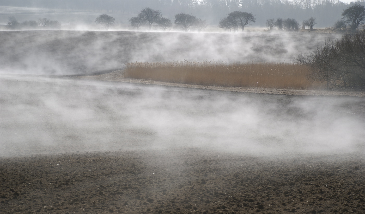Så kan det ske, at de nøgne, fugtige marker pludselig begynder at “dampe”: Det ser ud, som om der trækker let røg af mulden, når små tågetunger danser roligt og lydløst over den bare jord.