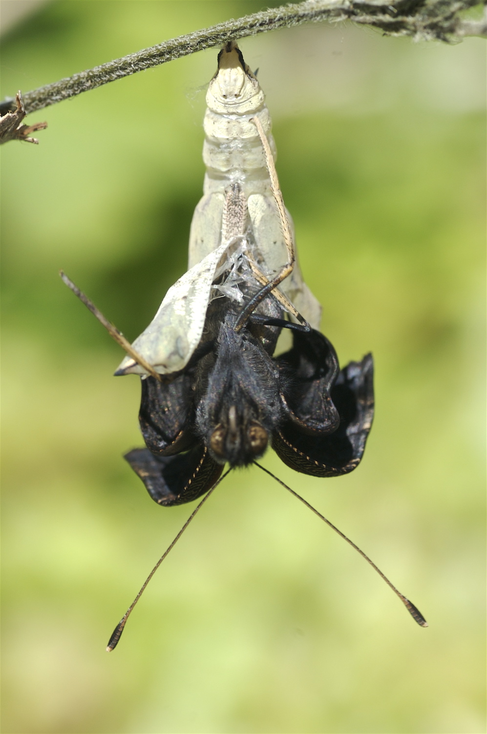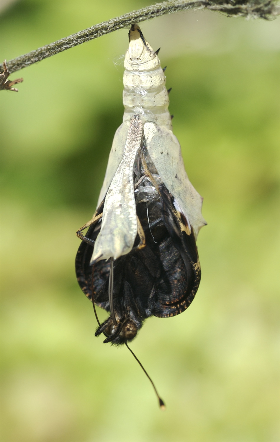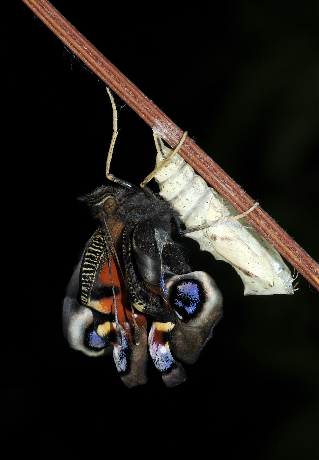 Dagpåfugleøje på høstanemone. Nedenfor ses, hvordan sommerfuglen kryber ud af puppen. (Fotos: Michael Stoltze).