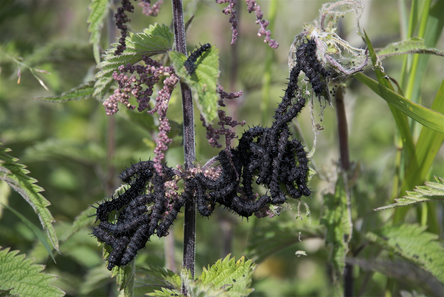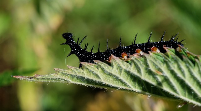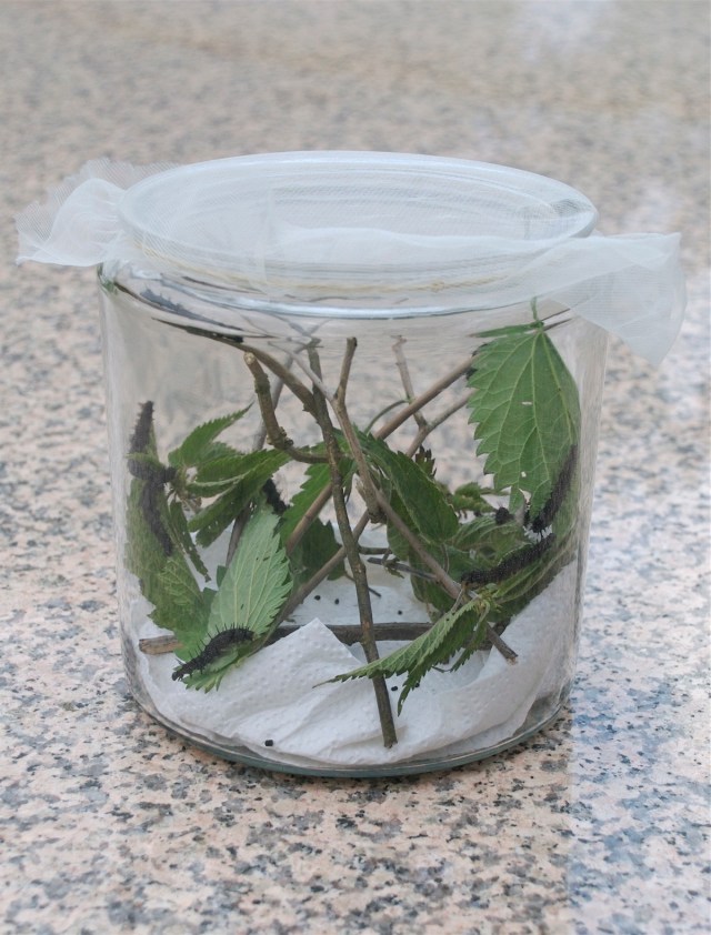 Store dagpåfugleøjelarver i bur. Stort glas med brændenældeskud og tørre kviste, som larverne kan forpuppe sig på. Glasset er dækket af net fæstnet med en ekastik. I bunden lidt køkkenrulle, som opfanger larvernes ekskrementer. Ekskrementer fjernes efter behov og køkkenrullen skiftes. Store larver forpupper sig efter 2-3 dage. De skal fodres med friske nældeskud hver dag, så behøver de intet at drikke, da der er vand nok i kosten. Larverne holdes indendørs ved stuetemperatur. (Foto: Michael Stoltze).