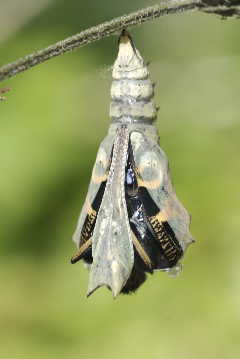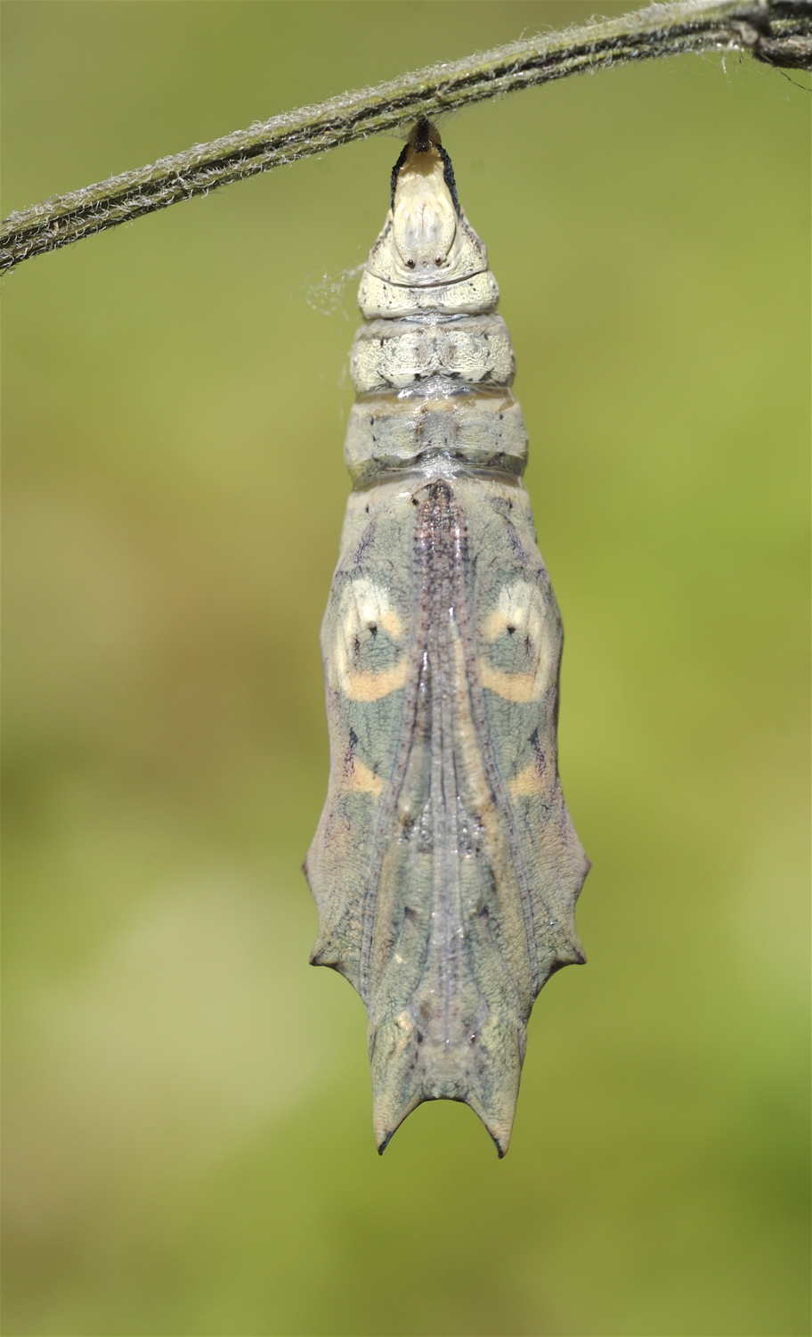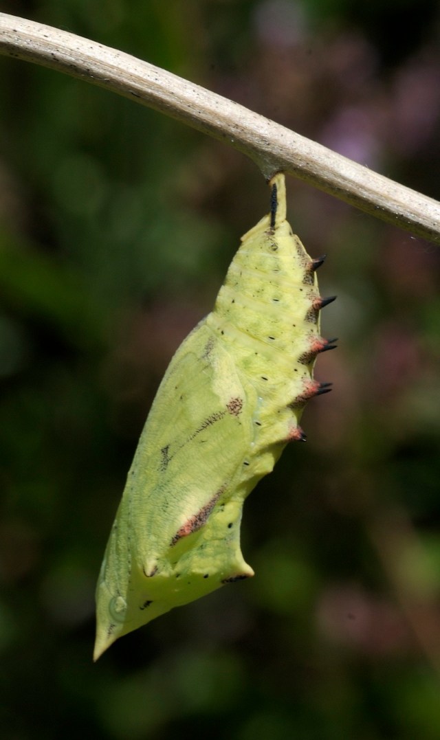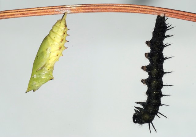 Dagpåfugleøjelarven til højre har spundet sig fast og er ved at forpuppe sig. Til venstre en ny puppe, der lige har kastet larvehuden. Sommerfuglen kryber ud af puppen efter omkring 14 dage, hvis pupperne står ved stuetemperatur. Hvis det er koldt, tager det længete tid. Lysforhold under larve- og puppetiden er underordnet, når man holder dyrene i bur. (Foto: Michael Stoltze).