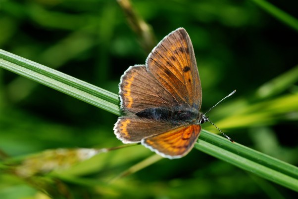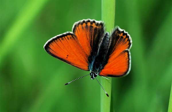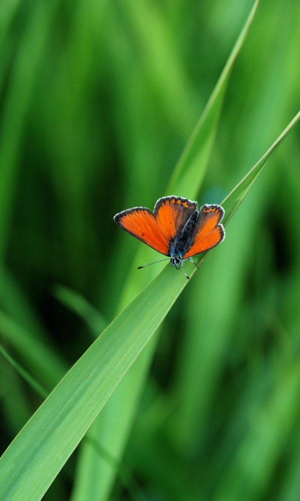 Det smukke par er violetrandet ildfugl (Lycaena hippothoe) og isblåfugl (Polyommatus amanda). De dukker op med skinnende metalfarver som ild og vand på engen næsten på samme tid af året. Og som nyforvandlede stråler de om kap i solen, som var det en skønhedskonkurrence.
