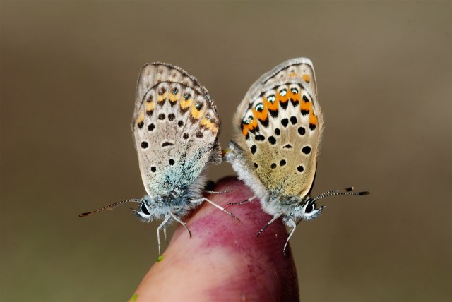 De to blåfugle sad i vegetationen, da vi plukkede blåbær. Skønhederne lever kun et par uger. Deres korte liv handler udelukkende om parring og æglægning. (Foto: Michael Stoltze).