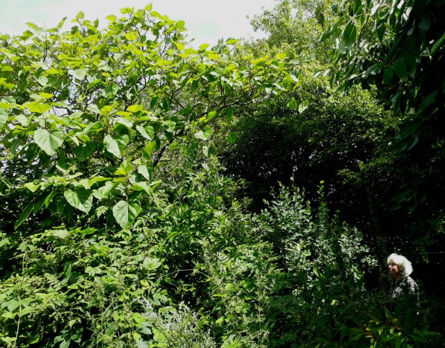 “I april 2007 fik Lars at vide, at Astrid ventede sig. Han var meget syg på det tidspunkt, men han forstod det, og det var en af de få gange, han græd. Af glæde og bevægelse, men siden har jeg tænkt, at det også var af sorg. Han vidste godt, han ikke ville opleve at se sit barnebarn”, fortalte Sue og tørrede øjnene for anden gang i løbet af vores samtale. Vi vender os igen mod haven og fuglene. I de første år var der et godt udsyn over markerne, og påskelørdag i 1979 kaldte Lars insisterende på Sue. Det var stortrappen, en af verdens største flyvende fugle, som at uransaglige grunde havde valgt at lægge vejen forbi Saltunavej. I dag er træer og buske vokset godt i højden på grunden, og der er mange flere småfugle end før. Men udsynet er ikke så godt mere. Et par hundrede meter væk, bag pilene, flyver en ravn lavt over landskabet og udstøder sit hæse “grok-grok-grok”. Der var ingen ravne på Bornholm, da Sue og Lars kom til øen. Nu er de vendt tilbage. Lars kommer ikke tilbage. Nevermore. Blomsterhavet er overvældende, og haven summer af liv og er ligeglad. Ligesom hornuglen, der en sen og stille sommeraften uforklarligt fulgte Sue ganske tæt under hendes vandring frem mod huset. Roligt og lydløst drog uglen med hende. Som et lys i mørket bare et par meter væk var det, som om den ville fortælle noget. Inden jeg kørte fra stedet så jeg kejsertræet. Det bugnede af store, grønne frøkapsler efter forårets blå blomstring.