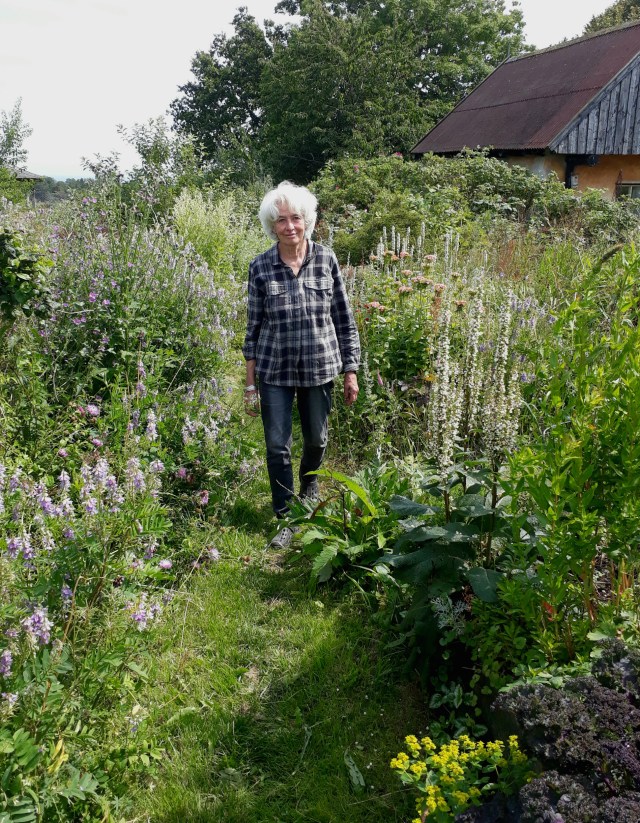 Mens vi sunder os, ser vi ud over blomsterhavet, hvor græsrandøjer, grønårede kålsommerfugle og nyforvandlede takvinger boltrer sig, og jeg får øje på noget grønt 10 meter væk i en af de fede blomsterstande på en sommerfuglebusk. En moskusbuk? Desværre, ved nærmere eftersyn viser det sig blot at være et grønt blad. Men haven er omgivet af mange piletræer, som den prægtige moskusbuk kan leve i, så Sue beslutter at læse om billen og se efter den på havens hjortetrøst og andre blomster. Sue er morgenmenneske og står gerne op mellem klokken fem og seks. Der er altid mange planter at se til og meget at gøre i haven. Børnene kommer ofte til Bornholm, især om sommeren. I den store snestorm i 2010-11 måtte hun lide den tort at holde jul alene, da alt var lammet og Halfdan strandede i Rønne. Men oftere tager hun over til børnene på Sjælland. Halfdan er arkitekt hos Henning Larsen og Cille er med stor succes med til at drive en specialbutik i kaktus. Astrid og Martin bor med børnene i et bofællesskab under Lille Svendstrup Gods. Astrid er PhD-studerende ved Institut for Tværkulturelle og Regionale Studier ved Københavns Universitet og Martin er viceforstander på et AOF sprogcenter.