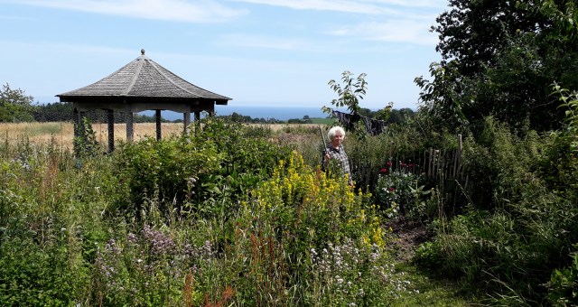 Ejendommen blev rammen om et liv med have og natur. Sue dyrkede sin interesse for botanik og have, og Lars dyrkede sin interesse for den vilde natur og navnlig insekter, hvor han blev Danmarks førende specialist i cikader og skrev videnskabelige artikler og populære bøger om natur. Datteren Astrid kom til i 1982 og i 1986 fik Sue og Lars sønnen Halfdan. Astrid bor i dag med manden Martin nær Ringsted, mens Halfdan bor med kæresten Cille i København. Astrid og Martin har børnene Augusta på 10 og Olaf på syv år. Lars vidste besked med naturen. Han var en afholdt turleder, og blandt bornholmere fik han med god grund stjernestatus på grund af et utal af udsendelser i lokalradio og TV om stort og småt i naturen. Han var en blændende og rolig fortæller, som glad og begejstret delte ud af sin viden. Lars var en smuk mand, smilende og altid med en god fortælling om naturen på læben. Han anerkendte og fortalte også med levende begejstring anekdoter om alle de andre naturhistorikere han kendte og beundrede. Sidst i 1980’erne begyndte Sue at opformere sjældne og usædvanlige haveplanter til salg. To dage ugentligt sælger hun sine planter på torvet i Svaneke, og det har hun nu gjort i 28 år – de senere år med god hjælp fra en medarbejder. “Haven er ret vild og tilgroet, men kom bare alligevel”, siger Sue med en blanding af undskyldning og stolthed, da jeg træffer aftale om besøget. Som god haveromantiker bestemmer Sue over haven samtidig med, at hun lader haven bestemme mest muligt selv. “Men lige nu bestemmer haven lidt rigeligt”, siger hun med et smil, da jeg balancerer bakken med skoldhed te, småkager og tærte ad små stier ud til et lille havebord midt blomsterhavet. Undervejs standser vi ved et overdækket fuglefoderbræt, som en humle har erobret. Humlebladene skjuler en solsort, der ruger fast i reden, som den har valgt at placere lige dér på brættet, hvor den blev fodret i vinters. Fuglen ser os værdigt an fra sit leje og viger ikke en millimeter, selv om vi står blot en halv meter fra reden. “Jeg nænner ikke at klippe og beskære, når fuglene yngler”, sige Sue. Hun ved, at alt det vilde godt for fuglene. “Jeg lægger stor vægt på, at blomsterne er gode for sommerfugle og vilde bier, så det summer af liv”, fortæller Sue ude i blomstermarken. Hun taler et smukt dansk med klar diktion og en charmerende accent, som trods de 44 år i Danmark ikke efterlader tvivl om hendes engelske herkomst. Vi sætter ved bordet ude i haven. Skydækket letter, solen varmer, sommerfuglene flokkes om merian, og årets første store grønne løvgræshopper synger insisterende i blomsterengen. “Børnene er lidt bekymret for mig – om jeg kan magte at drive det. Men jeg trives og elsker det her sted, og skal nok bæres ud herfra”, svarer Sue, da jeg spørger, hvor længe hun vil blive boende på adressen. For 14 år siden blev Lars syg af kræft. Han kom under behandling med både transplantation og medicin, og i næsten et år fra 2005-2006 var han tilsyneladende kræftfri og fri af behandling. Han begyndte at gå korte ture omkring huset, og overvejede endda at genoptage produktionen af de populære naturudsendelser. Men trætheden var for stor, og sygdommen kom tilbage. I vinteren 2006-2007 tog sygdommen til. De sidste 14 dage var familien tæt samlet om ham på Rigshospitalet. Sue boede der og var ved hans side den 22. maj 2007, da han trak vejret for sidste gang. “Han var ikke ved bevidsthed til sidst. Han var rolig og holdt bare med ét op med at trække vejret. Det var fredeligt. Bagefter ønskede jeg at blive hos ham i værelset natten over. Det ville for mig have givet god mening i afskeden og sorgen. Men det var mod reglerne. Jeg ved ikke, om det stadig er sådan”, fortæller Sue, som synes at mange fremmede kulturer har et mere naturligt og værdigt forhold til døden og den døde, end vi har i Danmark. Sue valgte at blive boende i huset på Saltunavej, hvorfra hun stadig driver sin forretning med at opformere og sælge haveplanter. Lars tegnede og malede og fremstillede knive og mange ting til huset inspireret efter naturen. Hans arbejdsplads, hvor han elskede at sidde med sine bøger og mikroskoper og afsløre smålivets skønhed og hemmeligheder, er der endnu. Og en stor lygtebærercikade fra Afrika titter frem fra hylden over opslagstavlen med nogle af hans tegninger af små, farvestrålende cikader. “Jeg holder meget af, at hans ånd er her. Det giver mig ro, og jeg føler, jeg har et godt og rigt liv her på trods af tabet. Jeg lever og ånder for børnene, svigerbørnene, børnebørnene og stedet her, og har en god bekendtskabskreds takket være blandt andet min planteforretning. Jeg har ikke følt behov for at få en kæreste og føler mig ikke alene”, svarer Sue, da jeg spørger. Hendes øjne og mildhed viser, at hun hviler i sig selv og er hudløst ærlig. Det er sådan, det er.