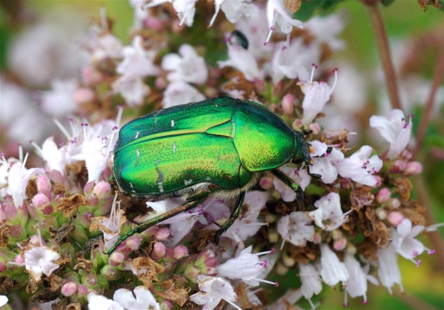 Den juvelstrålende guldbasse æder pollen og nektar på merian. Den lægger dækvingerne ned i flugten. Guldbasser er meget almindelige. (Foto: Michael Stoltze).