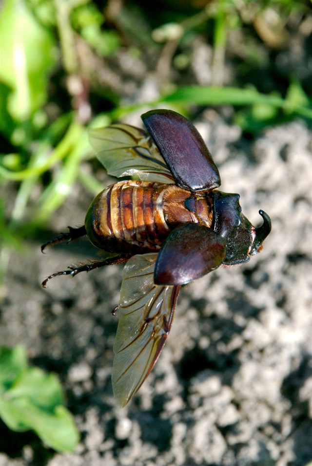 Næsehornsbille i flugt. Danmarks tungeste bille. Den lever i kompostbunker og især i savværkernes bunker af savsmuld. (Foto: Michael Stoltze).