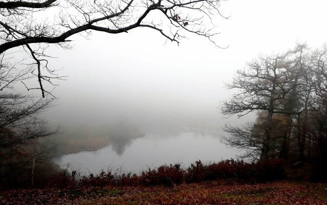 Udsigt fra Jomfrubjerget over Åremyr i Almindingen på Bornholm. Skoven er indhyldet i skyer, og der falder skjult regn gra træerne. (Foto: Michael Stoltze).