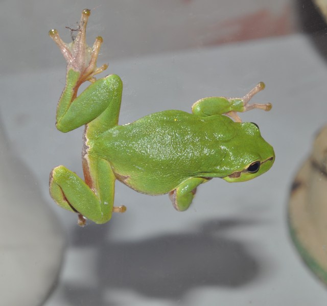 Det lykkedes trods mange og lange samtaler med de små frøer ikke for os at opdage én eneste i havens grønne buske. Men så kom tordenvejret til hjælp efter en steghed august uden en dråbe regn. Døren til haven stod åben ud til det frodige, lune skybrud, og pludselig råbte Mona begejstret: “Se!” Og sandelig: Det var løvfrøen, som var søgt ind i havestuen og klatrede omkring på rudens inderside i al sig strålende, grønne pragt.