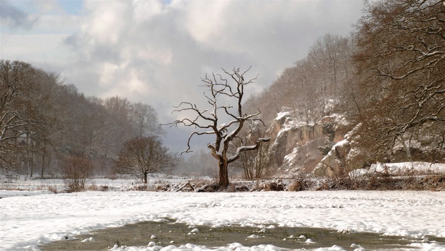 Død eg og snebyge i Ekkodalen. Kyndelmisse, 2 februar 2015