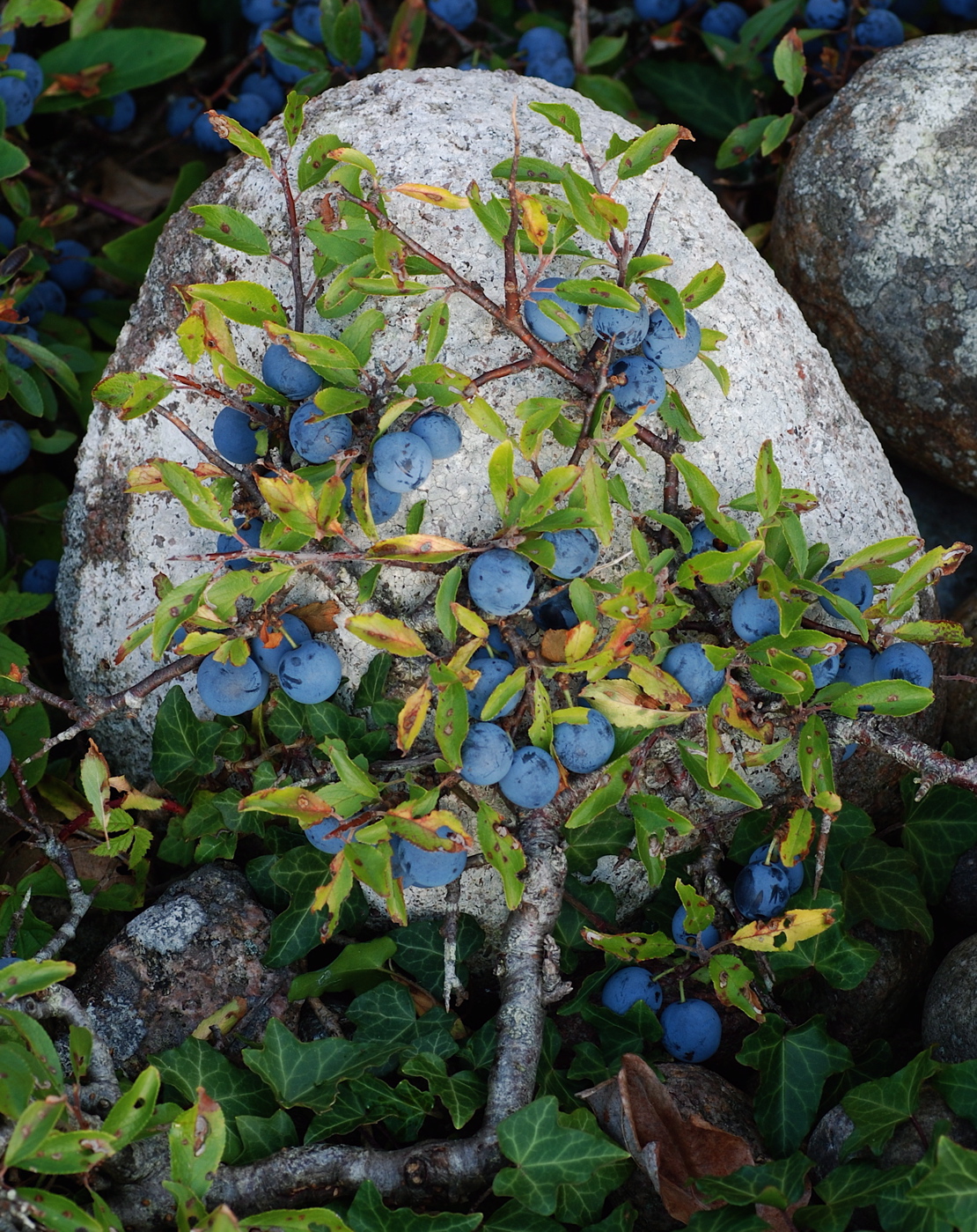 Slåenbusk med frugter ved rullesten. Møllevigen august 2017.